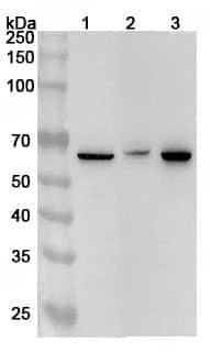 Western blot analysis was performed using anti-SALL4 polyclonal antibody at 1ug/mL on various samples.Lane 1:HepG2 cell lysateLane 2:PC-12 cell lysateLane 3:Raji cell lysate
