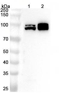 Western blot analysis was performed using anti-Human RAD18 polyclonal antibody at 1ug/mL on recombinant Human RAD18 (Catalog No.:TD-HP030012).,Western blot analysis was performed using anti-RAD18 polyclonal antibody at 1ug/mL on various samples.Lane 1:Mouse brain lysateLane 2:Rat brain lysate