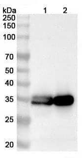 Western blot analysis was performed using anti-HLA-DRA polyclonal antibody at 1ug/mL on various samples.Lane 1:Daudi cell lysateLane 2:Raji cell lysate