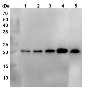 Western blot analysis was performed using anti-DNDUFB10 polyclonal antibody at 1μg/ml on various samples.Lane 1:Hela cell lysateLane 2:MCF-7 cell lysateLane 3:293T cell lysateLane 4:A549 cell lysateLane 5:Mouse heart lysate