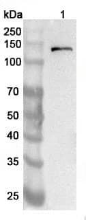 Western blot analysis was performed using anti-ULK1 polyclonal antibody at 1ug/mL on various samples.Lane 1:Mouse brain lysate
