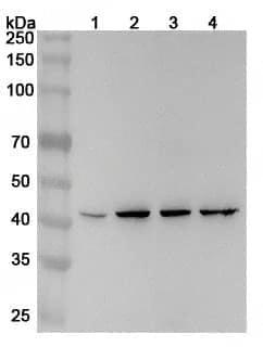 Western blot analysis was performed using anti-DNAJA2 polyclonal antibody at 1ug/mL on various samples.Lane 1:A375 cell lysateLane 2:HepG2 cell lysateLane 3:Jurkat cell lysateLane 4:K562 cell lysate