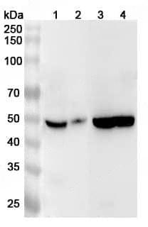 Western blot analysis was performed using anti-FAM20B polyclonal antibody at FAM20B on various samples.Lane 1:Mouse brain lysateLane 2:Mouse cerebellum lysateLane 3:Rat brain lysateLane 4:Rat cerebellum lysate