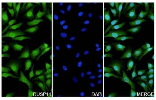Hela cells were fixed with 4% paraformaldehyde for 20 minutes, followed by blocking with 5% goat serum for 1 hour. The cells were then incubated with a primary antibody targeting DUSP11 (TD-HF776014) at a concentration of 38.4 ug/ml overnight at 4°C. Afterward, the cells were incubated with a secondary antibody, Goat Anti-Rabbit IgG (Alexa Fluor-488) for 50 minutes at room temperature. The localization of DUSP11 was visualized (shown in green), and nuclear DNA was stained with DAPI (shown in blue).