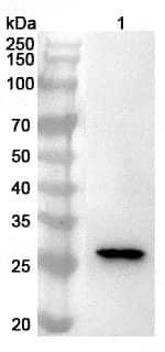 Western blot analysis was performed using anti-NOL3 polyclonal antibody at 1ug/mL on various samples.Lane 1:MCF-7 cell lysate