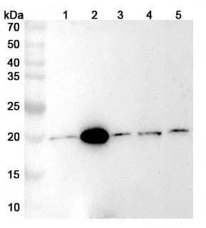 Western blot analysis was performed using anti-GGCT polyclonal antibody at GGCT on various samples.Lane 1:Hela cell lysateLane 2:U937 cell lysateLane 3:Jurkat cell lysateLane 4:293T cell lysateLane 5:A549 cell lysate