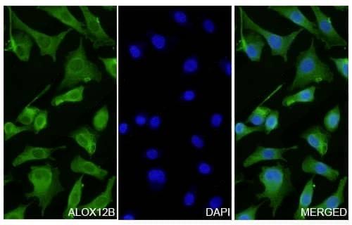 A549 cells were fixed with 4% paraformaldehyde for 20 minutes, followed by blocking with 5% goat serum for 1 hour. The cells were then incubated with a primary antibody targeting ALOX12B (TD-HF742014) at a concentration of 28 ug/ml overnight at 4°C. Afterward, the cells were incubated with a secondary antibody, Goat Anti-Rabbit IgG (Alexa Fluor-488) for 50 minutes at room temperature. The localization of ALOX12B was visualized (shown in green), and nuclear DNA was stained with DAPI (shown in blue).