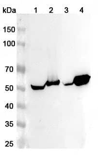 Western blot analysis was performed using anti-PPM1B polyclonal antibody at PPM1B on various samples.Lane 1:Mouse brain lysateLane 2:Mouse heart lysateLane 3:Rat brain lysateLane 4:Rat heart lysate