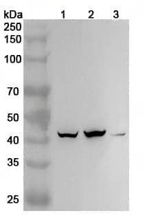 Western blot analysis was performed using anti-TBX19 polyclonal antibody at 1ug/mL on various samples.Lane 1:Mouse brain lysateLane 2:Rat brain lysateLane 3:Rat liver lysate