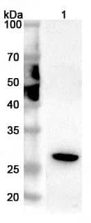 Western blot analysis was performed using anti-GPX5 polyclonal antibody at 1µg/ml on various samples.Lane 1:Mouse liver lysate