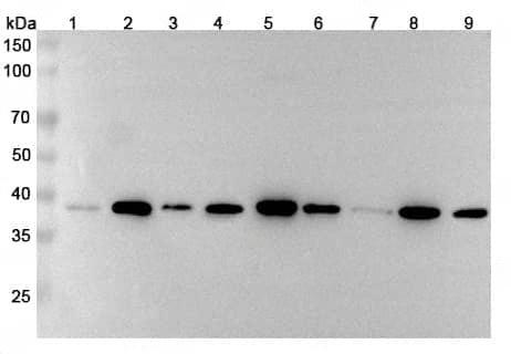 Western blot analysis was performed using anti-MACROH1A2 polyclonal antibody at 1μg/ml on various samples.Lane 1:MCF7 cell lysateLane 2:Hela cell lysateLane 3:Rat brain lysateLane 4:Rat liver lysateLane 5:293T cell lysateLane 6:HepG2 cell lysateLane 7:Mouse brain lysateLane 8:Mouse liver lysateLane 9:Rat lung lysate