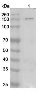 Western blot analysis was performed using anti-SMC2 polyclonal antibody at SMC2 on various samples.Lane 1:Raji cell lysate