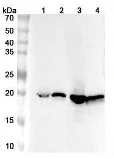 Western blot analysis was performed using anti-CRYAB polyclonal antibody at CRYAB on various samples.Lane 1:Mouse heart lysateLane 2:Rat heart lysateLane 3:Mouse eye lysateLane 4:Rat eye lysate