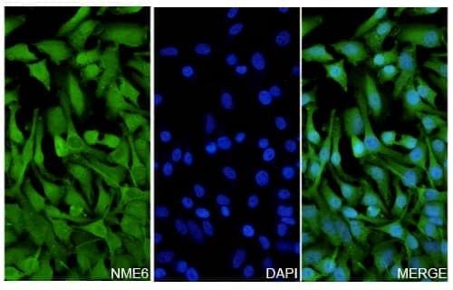 Hela cells were fixed with 4% paraformaldehyde for 20 minutes, followed by blocking with 5% goat serum for 1 hour. The cells were then incubated with a primary antibody targeting NME6 (TD-HF556014) at a concentration of 26.6 ug/ml overnight at 4°C. Afterward, the cells were incubated with a secondary antibody, Goat Anti-Rabbit IgG (Alexa Fluor-488) for 50 minutes at room temperature. The localization of NME6 was visualized (shown in green), and nuclear DNA was stained with DAPI (shown in blue). | Western blot analysis was performed using anti-NME6 polyclonal antibody at 1μg/ml on various samples.Lane 1:Lncap cell lysateLane 2:U20S cell lysate
