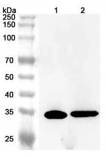 Western blot analysis was performed using anti-COQ9 polyclonal antibody at 1ug/mL on various samples.Lane 1:Mouse heart lysateLane 2:Rat heart lysate