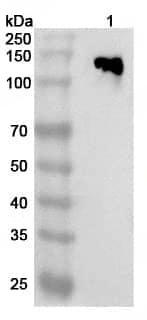 Western blot analysis was performed using anti-CDH17 polyclonal antibody at 1ug/mL on various samples.Lane 1:Mouse colon lysate