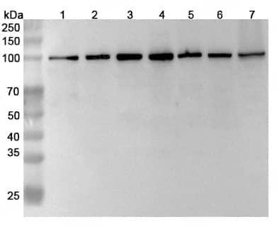 Western blot analysis was performed using anti-MCM6 polyclonal antibody at 1μg/ml on various samples.Lane 1:HL60 cell lysateLane 2:Hela cell lysateLane 3:Jurkat cell lysateLane 4:HepG2 cell lysateLane 5:PC12 cell lysateLane 6:NIH3T3 cell lysateLane 7:Mouse spleen lysate
