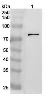 Western blot analysis was performed using anti-GFPT1 polyclonal antibody at 1ug/mL on various samples.Lane 1:Jurkat cell lysate