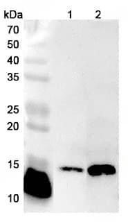 Western blot analysis was performed using anti-SSBP1 polyclonal antibody at 1μg/ml on various samples.Lane 1:A549 cell lysateLane 2:SW620 cell lysate