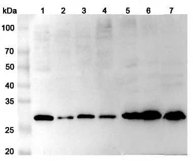 Western blot analysis was performed using anti-DPT polyclonal antibody at 1μg/ml on various samples.Lane 1:HepG2 cell lysateLane 2:HL-60 cell lysateLane 3:Hela cell lysateLane 4:Mouse liver lysateLane 5:Mouse brain lysateLane 6:Rat brain lysate