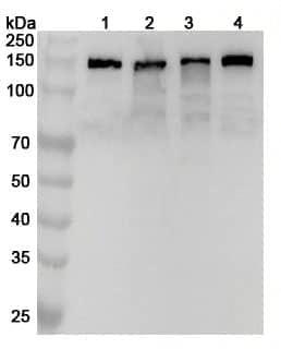Western blot analysis was performed using anti-GOLGA2 polyclonal antibody at 1ug/mL on various samples.Lane 1:Hela cell lysateLane 2:A549 cell lysateLane 3:HepG2 cell lysateLane 4:K562 cell lysate