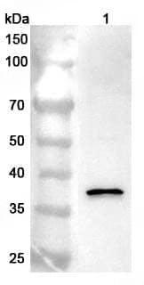 Western blot analysis was performed using anti-RAD51 polyclonal antibody at 1ug/mL on various samples.Lane 1:K562 cell lysate