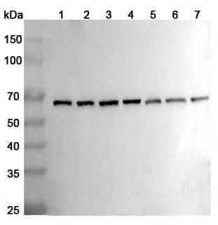 Western blot analysis was performed using anti-Beclin-1 polyclonal antibody at 1ug/mL on various samples.Lane 1:Jurkat cell lysateLane 2:Mouse testis lysateLane 3:Mouse brain lysateLane 4:Mouse lung lysateLane 5:Rat testis lysateLane 6:Rat brain lysateLane 7:Rat lung lysate