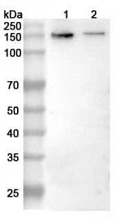 Western blot analysis was performed using anti-GRIN2B polyclonal antibody at 1ug/mL on various samples.Lane 1:Mouse brain lysateLane 2:Rat brain lysate
