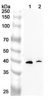 Western blot analysis was performed using anti-DMC1 polyclonal antibody at 1μg/ml on various samples.Lane 1:Mouse testis lysateLane 2:Rat testis lysate