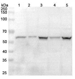 Western blot analysis was performed using anti-HSPA14 polyclonal antibody at 1μg/ml on various samples.Lane 1:SW620 cell lysateLane 2:Jurkat cell lysateLane 3:K562 cell lysateLane 4:HepG2 cell lysateLane 5:293T cell lysate