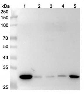 Western blot analysis was performed using anti-MTAP polyclonal antibody at 1μg/ml on various samples.Lane 1:NIH3T3 cell lysateLane 2:HT-29 cell lysateLane 3:Raji cell lysateLane 4:Hela cell lysateLane 5:HCT116 cell lysate