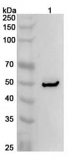 Western blot analysis was performed using anti-BMP6 polyclonal antibody at 1ug/mL on various samples.Lane 1:Mouse heart lysate