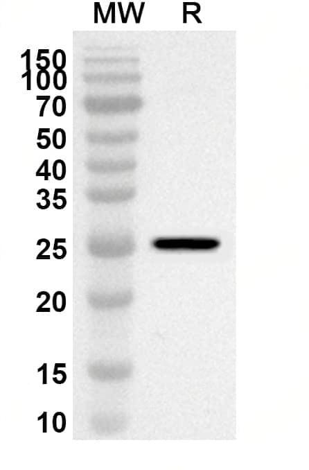 Western blot analysis was performed using anti-Human FOLR1 polyclonal antibody at 1ug/mL on recombinant Human FOLR1 (Catalog No.:TD-HB825012).