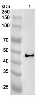 Western blot analysis was performed using anti-HLA-G polyclonal antibody at 1ug/mL on various samples.Lane 1:PC-12 cell lysate