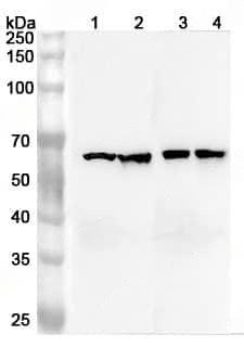 Western blot analysis was performed using anti-ARFGAP3 polyclonal antibody at 1ug/mL on various samples.Lane 1:Mouse heart lysateLane 2:Mouse kidney lysateLane 3:Rat heart lysateLane 4:Rat kidney lysate