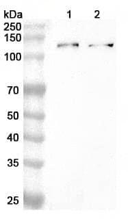 Western blot analysis was performed using anti-ATP13A1 polyclonal antibody at 1ug/mL on various samples.Lane 1:Mouse heart lysateLane 2:Mouse brain lysate