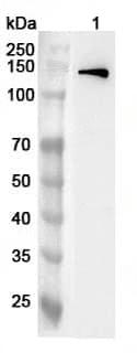 Western blot analysis was performed using anti-USP37 polyclonal antibody at 1ug/mL on various samples.Lane 1:Mouse spleen lysate