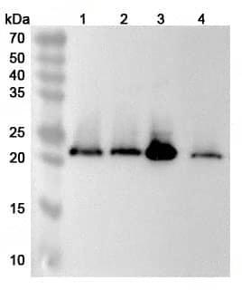 Western blot analysis was performed using anti-TMED3 polyclonal antibody at 1ug/mL on various samples.Lane 1:Hela cell lysateLane 2:Jurkat cell lysateLane 3:MCF-7 cell lysateLane 4:A431 cell lysate