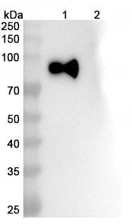 SDS-PAGE for InVivoMAb Anti-SARS-CoV-2 S2/Spike glycoprotein 2 Antibody (28D9) | Detects recombinant SARS-CoV-2 spike protein S2 in indirect ELISA | Western blot analysis was performed using anti-/ monoclonal antibody at 1ug/mL on various samples.Lane 1:ATGE5729 200ngLane 2:1* loading buffer