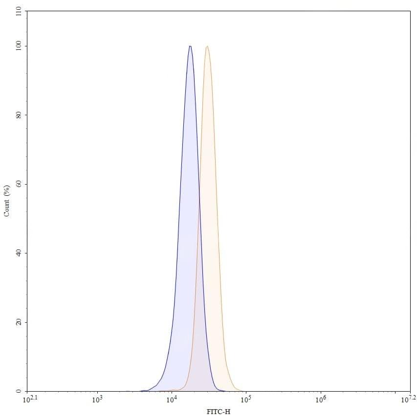 SDS-PAGE for Research Grade Lenvervimab | Flow-cytometry using PE anti-human RSF1 antibody. K562 cells were fixed and permeabilized, then stained with an irrelevant antibody (Blue Histogram) or an PE anti-human RSF1 monoclonal antibody (Catalog VK619016, Yellow Histogram) at a concentration of 5 µg/ml for 30 mins at RT. After washing, cells analysed on a NovoCyte Flow Cytometer. ### Flow-cytometry using FITC anti-human RSF1 antibody. K562 cells were fixed and permeabilized, then stained with an irrelevant antibody (Blue Histogram) or an FITC anti-human RSF1 monoclonal antibody (Catalog VK619016, Yellow Histogram) at a concentration of 5 µg/ml for 30 mins at RT. After washing, cells analysed on a NovoCyte Flow Cytometer.