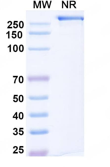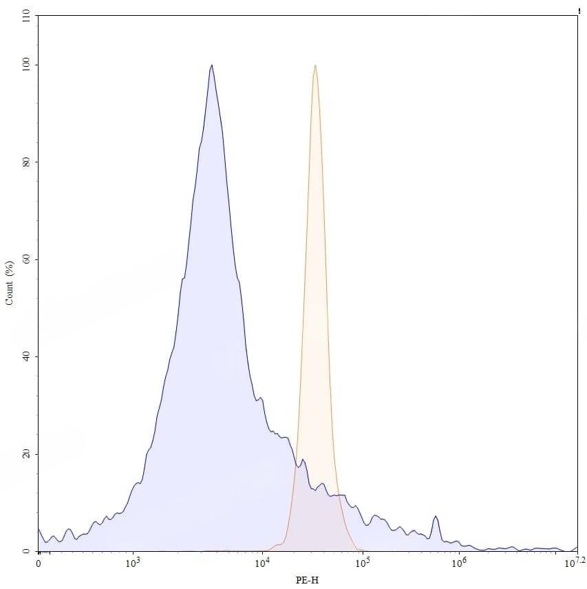 SEC-HPLC detection for Research Grade Gantenerumab. | SDS-PAGE for Research Grade Gantenerumab. | Flow-cytometry using anti-human APP antibody. SH-SY5Y cells were fixed and permeabilized, then stained with an irrelevant antibody (Blue Histogram) or an anti-human APP monoclonal antibody (Catalog HY235036, Yellow Histogram) at a concentration of 5 µg/ml for 30 mins at RT. After washing, bound antibody was detected using Goat Anti-Human IgG H&L Polyclonal Antibody, FITC (abinScience: HF690414) and cells analysed on a NovoCyte Flow Cytometer. | Flow-cytometry using APC anti-human APP antibody. SH-SY5Y cells were fixed and permeabilized, then stained with an irrelevant antibody (Blue Histogram) or an APC anti-human APP monoclonal antibody (Catalog HY235036, Yellow Histogram) at a concentration of 5 µg/ml for 30 mins at RT. After washing, cells analysed on a NovoCyte Flow Cytometer. ### Flow-cytometry using PE anti-human APP antibody. SH-SY5Y cells were fixed and permeabilized, then stained with an irrelevant antibody (Blue Histogram) or an PE anti-human APP monoclonal antibody (Catalog HY235036, Yellow Histogram) at a concentration of 5 µg/ml for 30 mins at RT. After washing, cells analysed on a NovoCyte Flow Cytometer. ### Flow-cytometry using FITC anti-human APP antibody. SH-SY5Y cells were fixed and permeabilized, then stained with an irrelevant antibody (Blue Histogram) or an FITC anti-human APP monoclonal antibody (Catalog HY235036, Yellow Histogram) at a concentration of 5 µg/ml for 30 mins at RT. After washing, cells analysed on a NovoCyte Flow Cytometer.