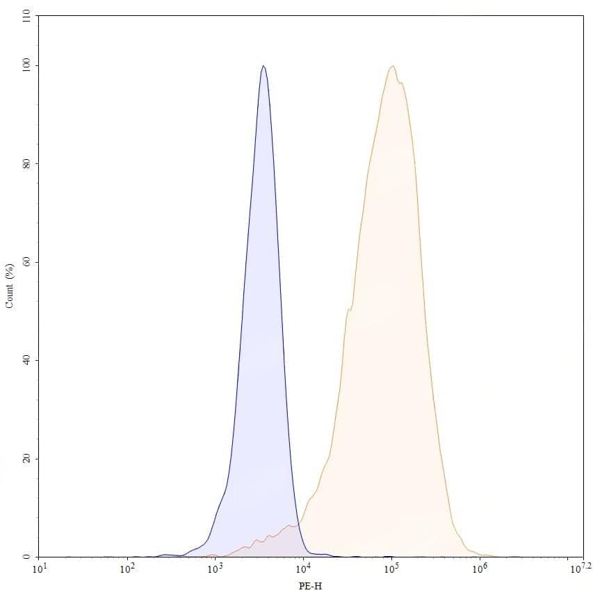 Flow-cytometry using APC anti-human CD117 antibody. HEL cells were stained with an irrelevant antibody (Blue Histogram) or an APC anti-human CD116 monoclonal antibody (Catalog: HY163026, Yellow Histogram) at a concentration of 5 µg/ml for 30 mins at RT. After washing, and cells analysed on a NovoCyte Flow Cytometer. ### Flow-cytometry using FITC anti-human CD117 antibody. HEL cells were stained with an irrelevant antibody (Blue Histogram) or an FITC anti-human CD116 monoclonal antibody (Catalog: HY163026, Yellow Histogram) at a concentration of 5 µg/ml for 30 mins at RT. After washing, and cells analysed on a NovoCyte Flow Cytometer. ### Flow-cytometry using PE anti-human CD117 antibody. HEL cells were stained with an irrelevant antibody (Blue Histogram) or an PE anti-human CD116 monoclonal antibody (Catalog: HY163026, Yellow Histogram) at a concentration of 5 µg/ml for 30 mins at RT. After washing, and cells analysed on a NovoCyte Flow Cytometer.