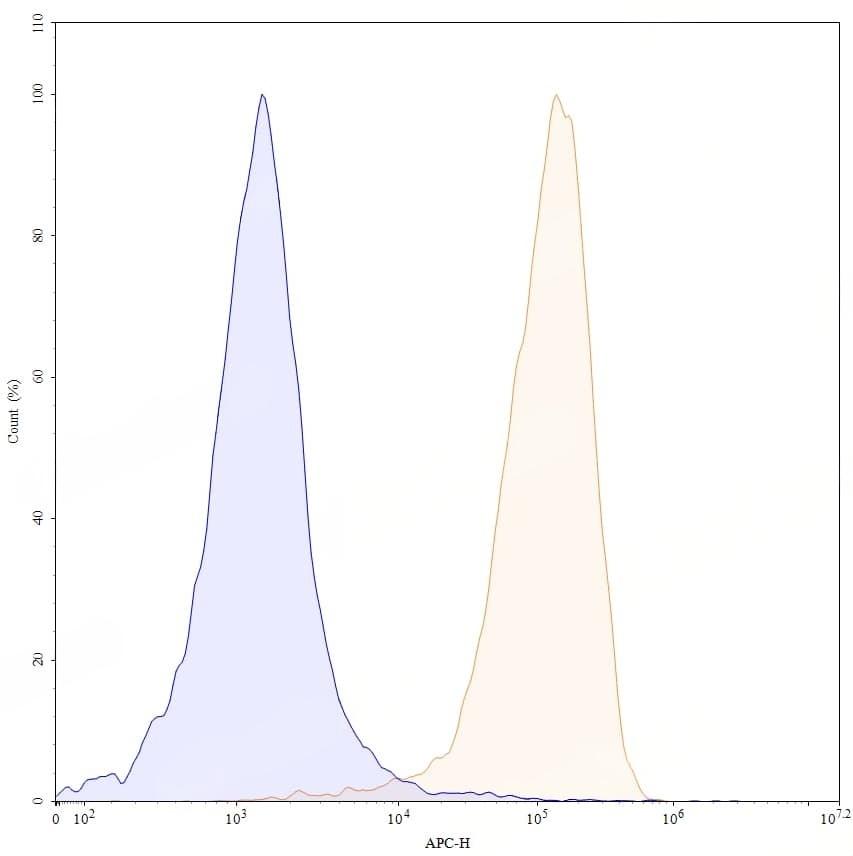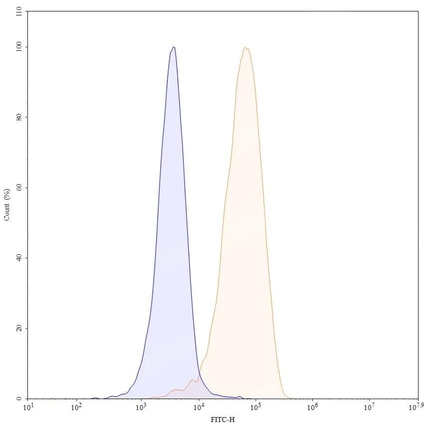 Detects CD79β/CD79B in indirect ELISAs. | SDS-PAGE for Research Grade Iladatuzumab | Western blot analysis was performed using anti-CD79β/CD79B monoclonal antibody at 1μg/ml on various samples.Lane 1:recombinant human CD79β/CD79B (Catalog No:TD-HW431011) | Flow-cytometry using APC anti-human CD79B antibody. Daudi cells were stained with an irrelevant antibody (Blue Histogram) or an APC anti-human CD79B monoclonal antibody (Catalog HW431026, Yellow Histogram) at a concentration of 5 µg/ml for 30 mins at RT. After washing, and cells analysed on a NovoCyte Flow Cytometer. ### Flow-cytometry using PE anti-human CD79B antibody. Daudi cells were stained with an irrelevant antibody (Blue Histogram) or an PE anti-human CD79B monoclonal antibody (Catalog HW431026, Yellow Histogram) at a concentration of 5 µg/ml for 30 mins at RT. After washing, and cells analysed on a NovoCyte Flow Cytometer. ### Flow-cytometry using FITC anti-human CD79B antibody. Daudi cells were stained with an irrelevant antibody (Blue Histogram) or an FITC anti-human CD79B monoclonal antibody (Catalog HW431026, Yellow Histogram) at a concentration of 5 µg/ml for 30 mins at RT. After washing, and cells analysed on a NovoCyte Flow Cytometer.