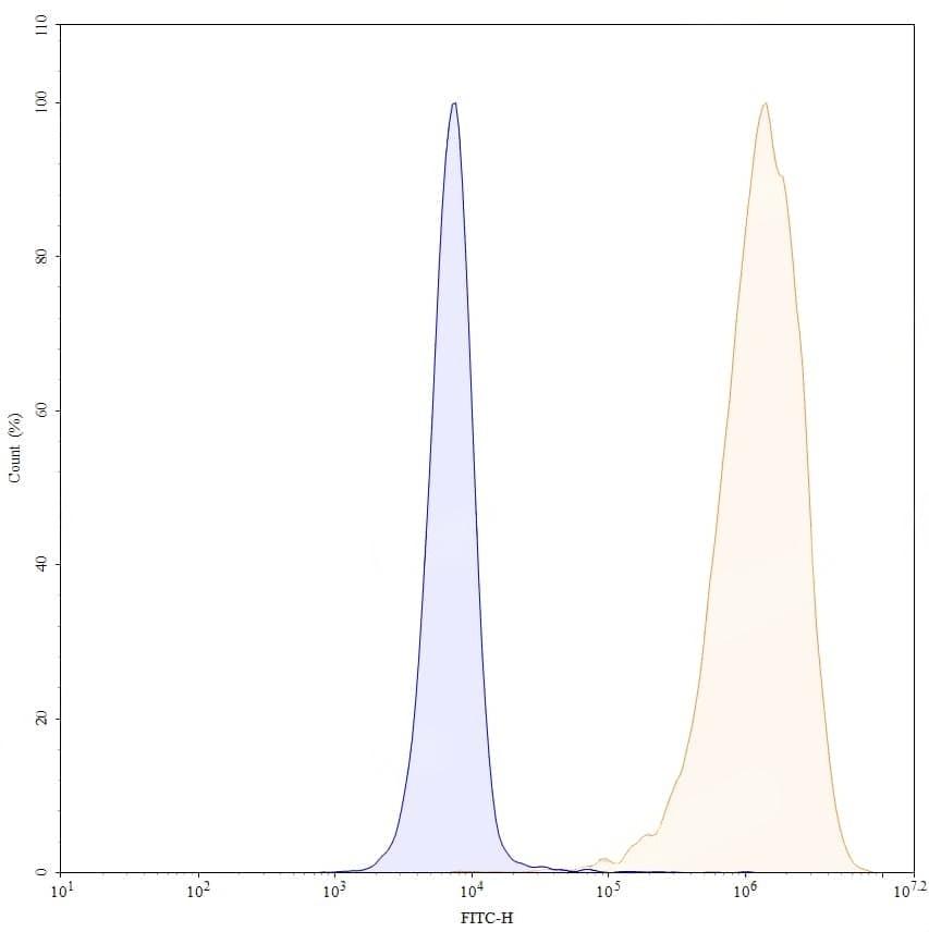 Detects PDL1 in indirect ELISA. ### Detects recombinant human PD1 (Cat No.:HS870021) in indirect ELISA. | Flow-cytometry using anti-human CD274 antibody. Untransfected cells (blue Histogram) and Transfected cells (Yellow Histogram) were stained with an anti-human CD274 monoclonal antibody (Catalog: HV974216) at a concentration of 5 µg/ml for 30 mins at RT. After washing, bound antibody was detected using a Goat Anti-Human IgG H&L Polyclonal Antibody, FITC (abinScience: HF690414) and cells analysed on a NovoCyte Flow Cytometer. | Western blot analysis was performed using anti-CD274/PD-L1/B7-H1 monoclonal antibody at 1ug/mL on various samples.Lane 1:recombinant human CD274/PD-L1/B7-H1 (Catalog No:TD-HV974011)Lane 2:negative control