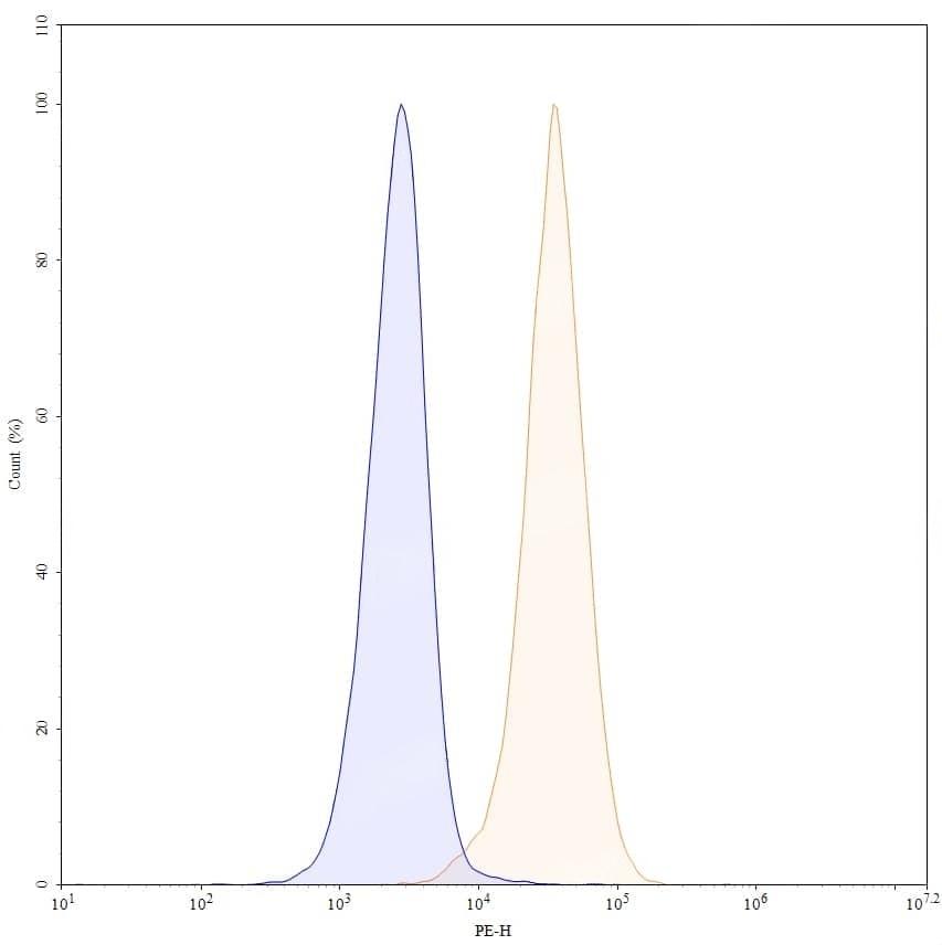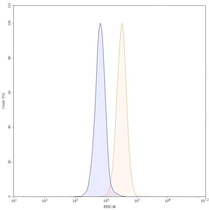 Detects CD274/PD-L1/B7-H1 in indirect ELISAs. | Flow-cytometry using APC anti-human CD274 antibody. MDA-MB-231 cells were stained with an irrelevant antibody (Blue Histogram) or an APC anti-human CD274 monoclonal antibody (Catalog: HV974086, Yellow Histogram) at a concentration of 5 µg/ml for 30 mins at RT. After washing, cells analysed on a NovoCyte Flow Cytometer. ### Flow-cytometry using FITC anti-human CD274 antibody. MDA-MB-231 cells were stained with an irrelevant antibody (Blue Histogram) or an FITC anti-human CD274 monoclonal antibody (Catalog: HV974086, Yellow Histogram) at a concentration of 5 µg/ml for 30 mins at RT. After washing, cells analysed on a NovoCyte Flow Cytometer. ### Flow-cytometry using PE anti-human CD274 antibody. MDA-MB-231 cells were stained with an irrelevant antibody (Blue Histogram) or an PE anti-human CD274 monoclonal antibody (Catalog: HV974086, Yellow Histogram) at a concentration of 5 µg/ml for 30 mins at RT. After washing, cells analysed on a NovoCyte Flow Cytometer. ### Flow-cytometry using anti-human CD274 antibody. Untransfected cells (blue Histogram) and Transfected cells (Yellow Histogram) were stained with an anti-human CD274 monoclonal antibody (Catalog: HV974086) at a concentration of 5 µg/ml for 30 mins at RT. After washing, bound antibody was detected using a Goat Anti-Human IgG H&L Polyclonal Antibody, FITC (abinScience: HF690414) and cells analysed on a NovoCyte Flow Cytometer.