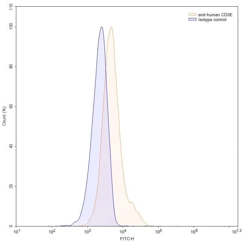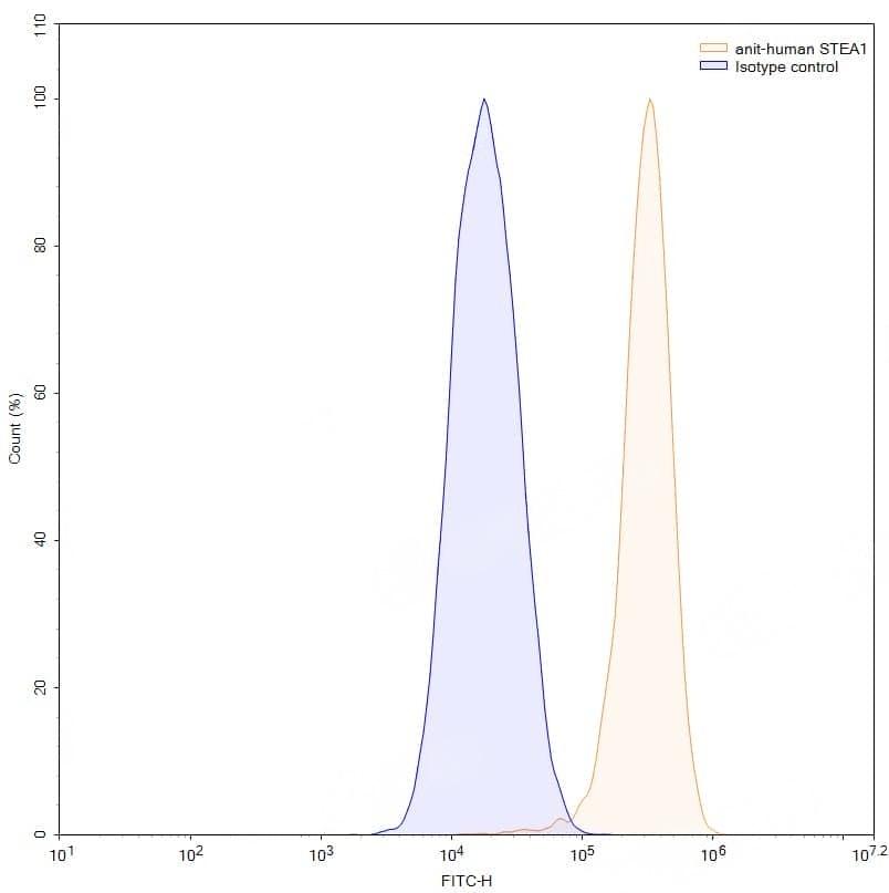 SEC-HPLC detection for Research Grade Xaluritamig. ### SDS-PAGE for Research Grade Xaluritamig. | Flow-cytometry using anti-human STEAP1 antibody. LNCAP cells were stained with an irrelevant antibody (Blue Histogram) or an anti-human STEAP1 monoclonal antibody (Catalog HV409026, Yellow Histogram) at a concentration of 5 µg/ml for 30 mins at RT. After washing, bound antibody was detected using a Goat Anti-Human IgG H&L Polyclonal Antibody, FITC (abinScience: HF690414) and cells analysed on a NovoCyte Flow Cytometer. ### Flow-cytometry using anti-human CD3E antibody. Jurkat cells were stained with an irrelevant antibody (Blue Histogram) or an anti-human CD3E monoclonal antibody (Catalog HV409026, Yellow Histogram) at a concentration of 5 µg/ml for 30 mins at RT. After washing, bound antibody was detected using a Goat Anti-Human IgG H&L Polyclonal Antibody, FITC (abinScience: HF690414) and cells analysed on a NovoCyte Flow Cytometer.