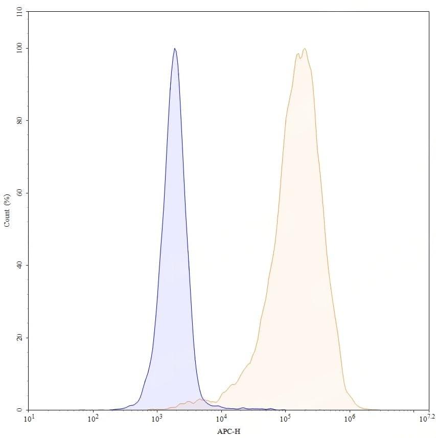 SDS-PAGE for Research Grade Venanprubart. | Flow-cytometry APC using anti-human CD272 antibody. Untransfected cells (blue Histogram) and Transfected cells (Yellow Histogram) were stained with an APC anti-human CD272 monoclonal antibody (Catalog HV375056) at a concentration of 5 µg/ml for 30 mins at RT. After washing, cells analysed on a NovoCyte Flow Cytometer. ### Flow-cytometry PE using anti-human CD272 antibody. Untransfected cells (blue Histogram) and Transfected cells (Yellow Histogram) were stained with an PE anti-human CD272 monoclonal antibody (Catalog HV375056) at a concentration of 5 µg/ml for 30 mins at RT. After washing, cells analysed on a NovoCyte Flow Cytometer. ### Flow-cytometry FITC using anti-human CD272 antibody. Untransfected cells (blue Histogram) and Transfected cells (Yellow Histogram) were stained with an FITC anti-human CD272 monoclonal antibody (Catalog HV375056) at a concentration of 5 µg/ml for 30 mins at RT. After washing, cells analysed on a NovoCyte Flow Cytometer.