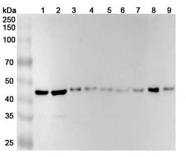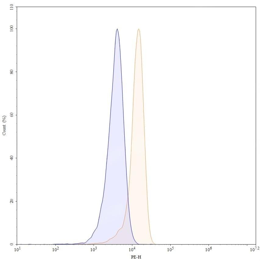 Western blot analysis was performed using anti-TSG101 monoclonal antibody at 1ug/mL on various samples.Lane 1:SH-SY5Y cell lysateLane 2:K562 cell lysateLane 3:NIH3T3 cell lysateLane 4:PC-12 cell lysateLane 5:Lncap cell lysateLane 6:293T cell lysateLane 7:Mouse brain lysateLane 8:Rat brain lysateLane 9:Rat heart lysate | Flow-cytometry using APC anti-human TSG101 antibody. Jurkat cells were fixed and permeabilized, then stained with an irrelevant antibody (Blue Histogram) or an APC anti-human TSG101 monoclonal antibody (Catalog No.:TD-HV181010, Yellow Histogram) at a concentration of 5 µg/ml for 30 mins at RT. After washing, cells analysed on a NovoCyte Flow Cytometer.,Flow-cytometry using PE anti-human TSG101 antibody. Jurkat cells were fixed and permeabilized, then stained with an irrelevant antibody (Blue Histogram) or an PE anti-human TSG101 monoclonal antibody (Catalog No.:TD-HV181010, Yellow Histogram) at a concentration of 5 µg/ml for 30 mins at RT. After washing, cells analysed on a NovoCyte Flow Cytometer.