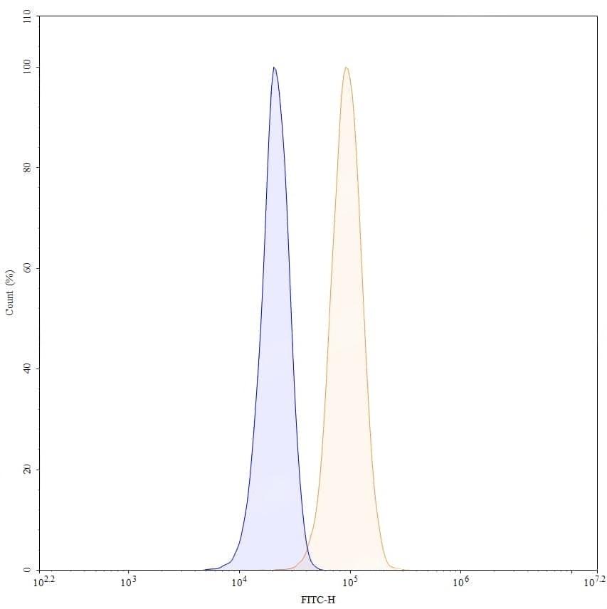 Detects Human VEGFA in indirect ELISAs. ### Detects Human ANGPT2 in indirect ELISAs. | SEC-HPLC detection for Research Grade Vanucizumab. | Flow-cytometry using FITC anti-human VEGFA&ANGPT2 antibody. U87 cells were fixed and permeabilized, then stained with an irrelevant antibody (Blue Histogram) or an FITC anti-human VEGFA&ANGPT2 monoclonal antibody (Catalog: HT073026, Yellow Histogram) at a concentration of 5 µg/ml for 30 mins at RT. After washing, cells analysed on a NovoCyte Flow Cytometer.