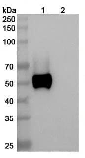 Western blot analysis was performed using anti-RAGE/AGER monoclonal antibody at 1ug/mL on various samples.Lane 1:recombinant human RAGE/AGER (Catalog No.:TD-HS925021)Lane 2:negative control